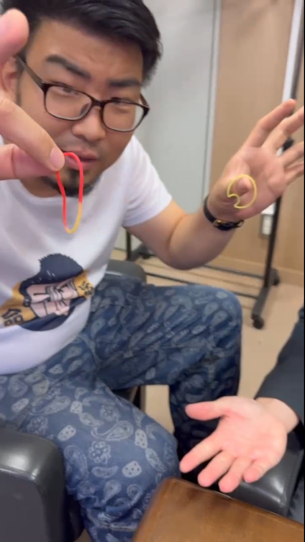 マジシャンはもう一本の黄色の輪ゴムを引っ張り一部分を取ってしまいます。