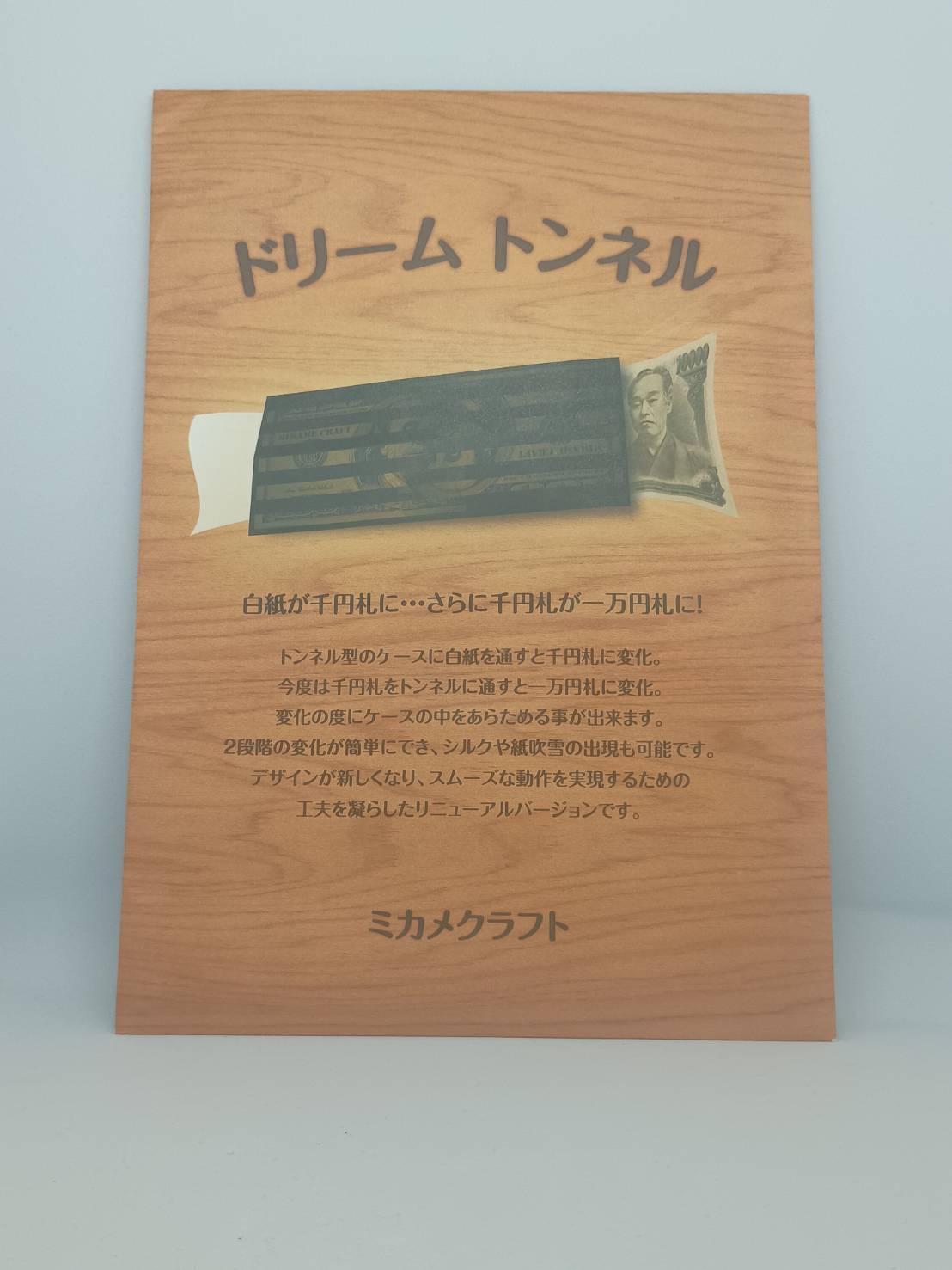 トンネル型のケースに白紙を通すと千円札に変化。 今度は千円札をトンネルに通すと一万円札に変化。 変化の度にケースの中をあらためる事が出来ます。 2段階の変化が簡単にでき、シルクや紙吹雪の出現も可能です。 デザインが新しくなり、スムーズな動作を実現するための工夫を凝らしたリニューアルバージョンです。